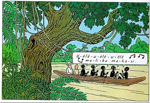 La pirogue aussi … Dans Tintin au Congo. l’embarcation est grande, les deux blancs (Tintin et le missionaire) se laissent transporter par cinq solides rameurs qui se donnent du courage avec une mélopée reprise en choeur.
