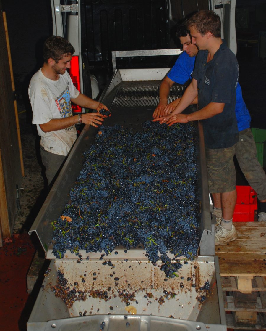Pas question d’y laisser des grappes vertes ou de la pourriture grise qui donneraient au moût de mauvais goûts. Jean apporte une attention particulière à ce contrôle à la cave.