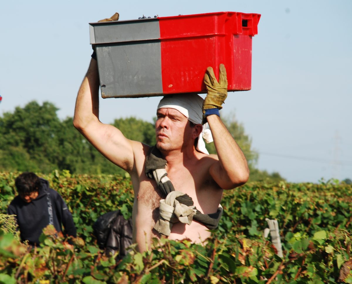 A part quelques uns , nous ne sommes pas des saisonniers agricoles professionnels. A défaut d’efficacité, nous avons le nombre et la bonne volonté : les caisses se remplissent vite, les porteurs les centralisent auprès des camionettes qui font l’aller-retour en direction de la cave où les grappes du pinot noir sont traitées.