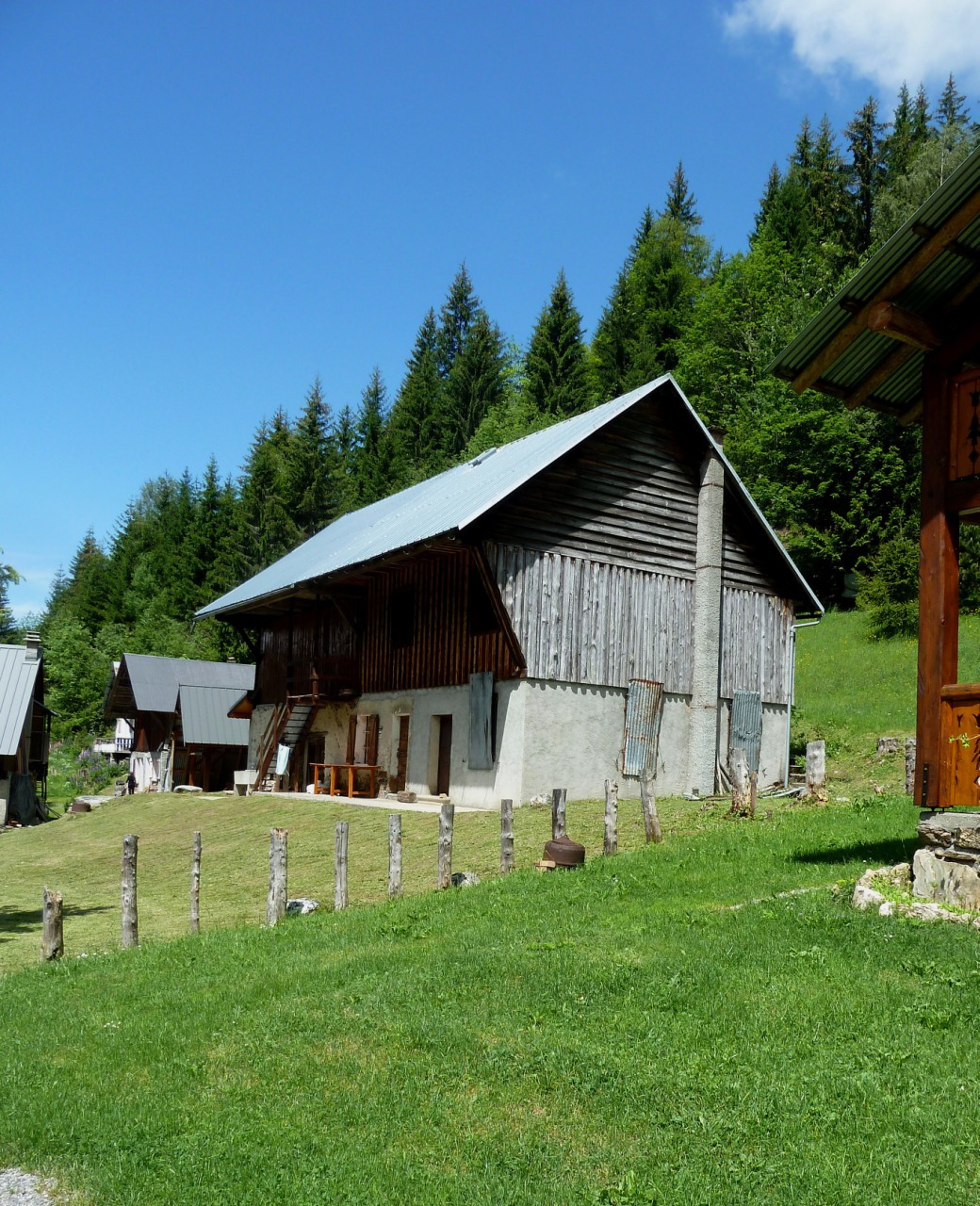La petite route n’est pas fameuse, ne laisse pas la place au croisement de deux véhicules et côtoie les précipices trop souvent à mon goût. Arrivés à destination , on goûte le charme et la paix de la situation. Une petite vallée, un replat avant les hauts sommets (le Grand Mont -2687m- , la Pointe de la Grande Journée -2462m), des cascades, un torrent vif – le Dard- et des alpages cernés de sapins noirs.