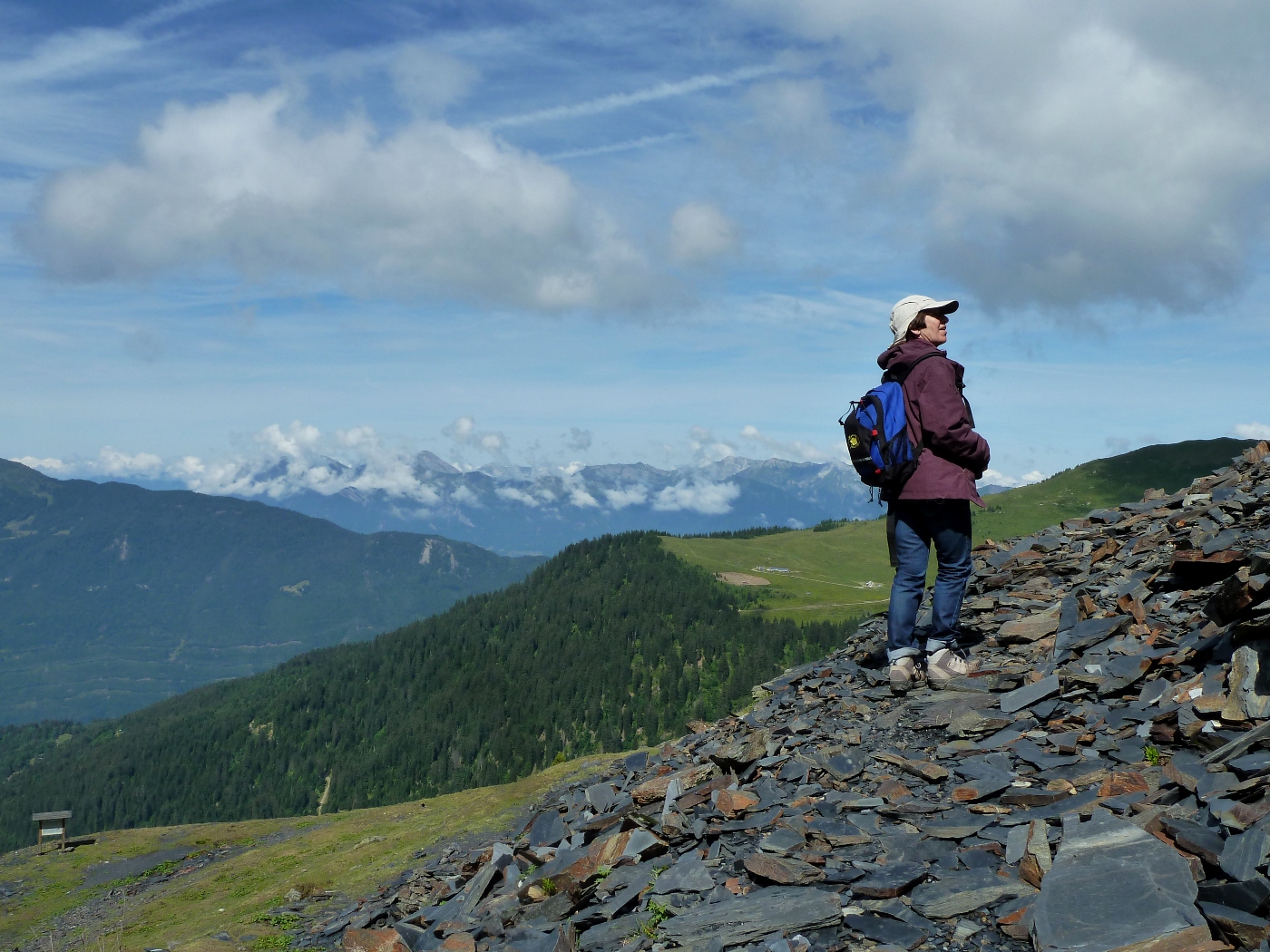 C’était aussi une étape avant de gagner à 2000 m les ardoisières. La piste, au début large et carrossable se termine par un vilain sentier dans les déchets glissants d’ardoises. Mais quel paysage lorsqu’on parvient au sommet !