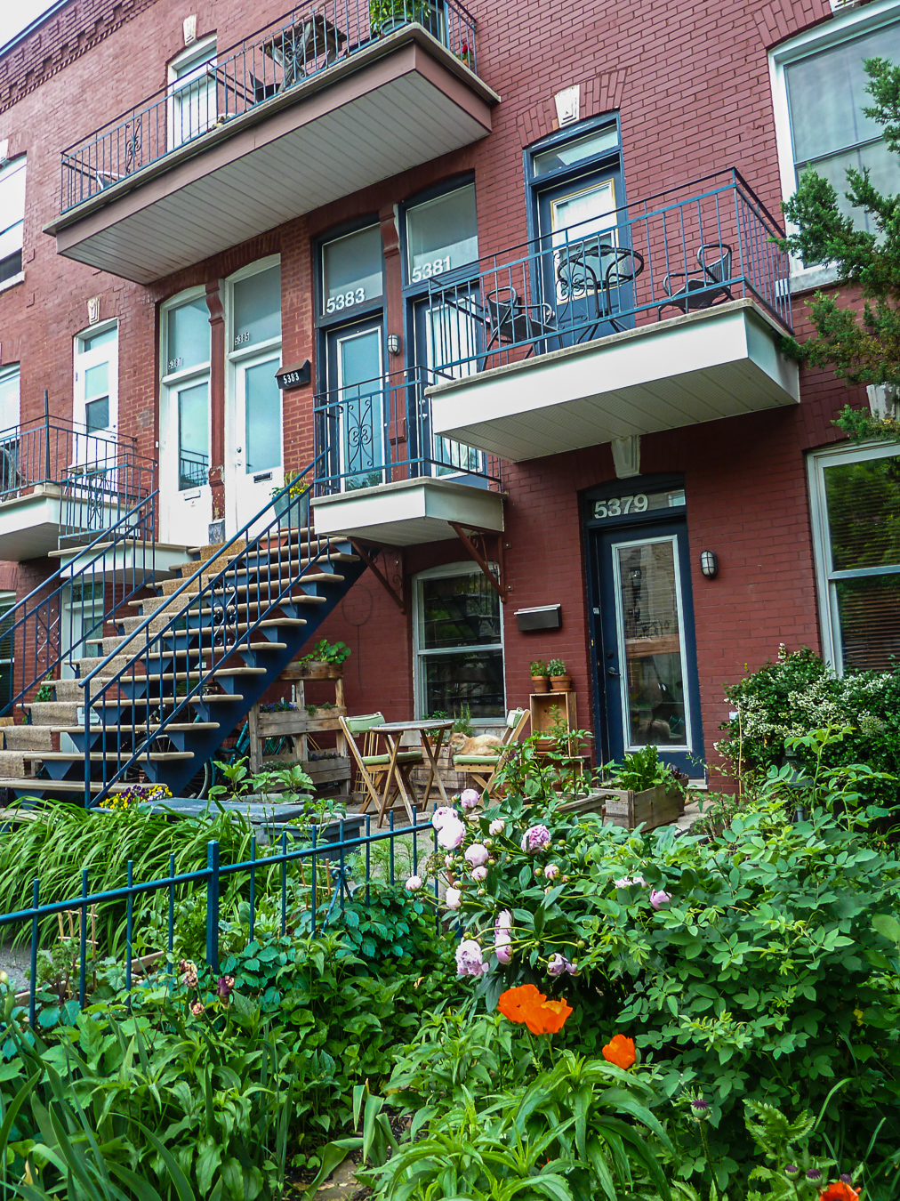 Les Montréalais ont inventé une modalité inédite de construction: Le logement à la fois individuel et collectif. Les petits immeubles sont en fait un empilement d’appartement individuels, chacun sa porte, son numéro et sa boîte à lettre, pas d’entrée ni d’escaliers collectifs. Tous des duplex ou des triplex avec escaliers extérieurs. On y rajoute un minuscule jardinet devant, souvent très soigné et le tour est joué. C’est ce qui donne cette physionomie particulière aux rues montréalaises.