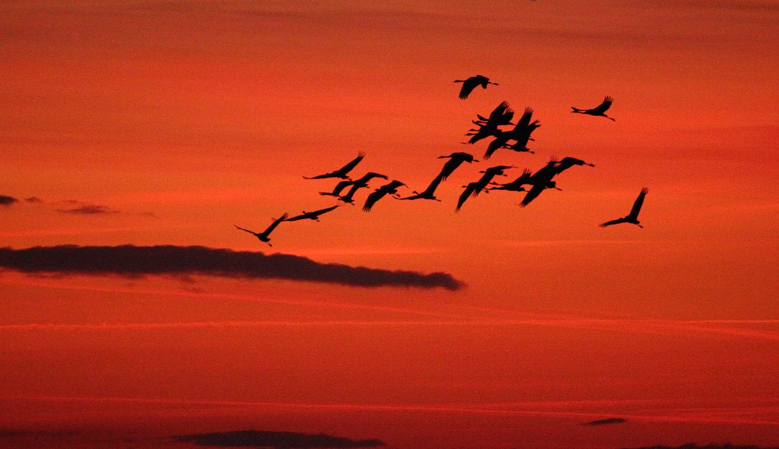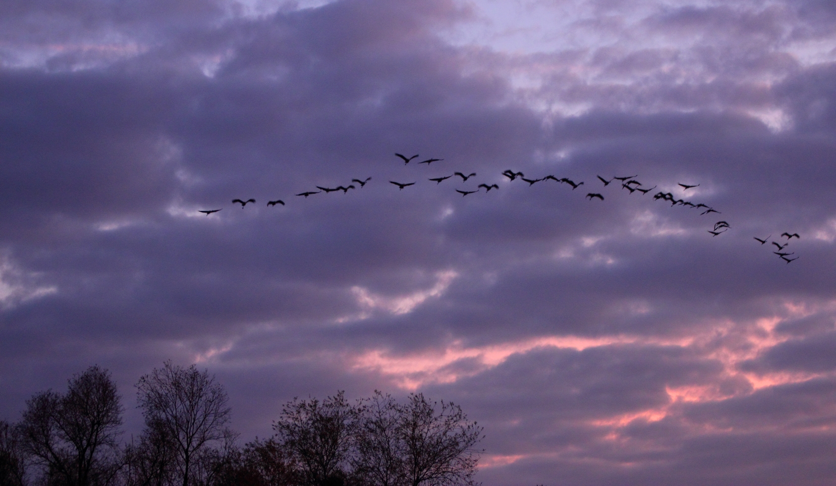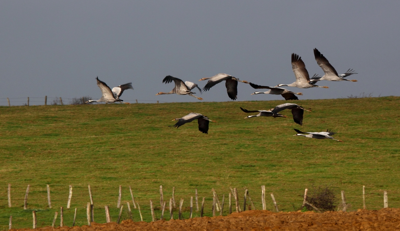 Et les grues arrivent tout de même. Elles reviennent des champs où elles ont picoré les restes de maïs entre les sillons du labour. Elles survolent le petit bosquet qui nous fait face.