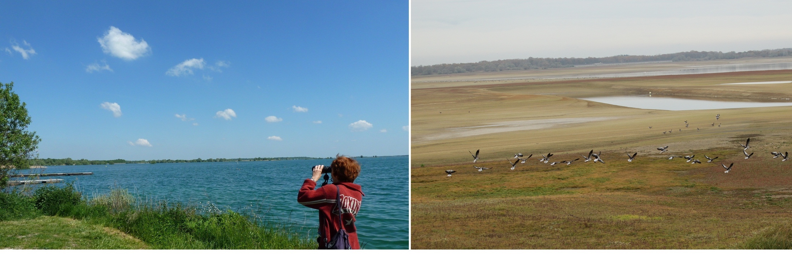 Arrivés sur le haut de la Digue : Surprise ! Nous connaissions le lac au mois de mai, une vaste étendue d’eau (à gauche sur la photo ci-dessus). En novembre, il n’y a plus que quelques flaques et beaucoup de bancs de sable parcourues par des bandes d’oies cendrées (à droite ci-dessus). C’est que le lac de Der fait partie du dispositif anti-crue de la Seine, vide l’hiver, il a la capacité d’absorber la montée des eaux de la Marne et l’été il fait la joie des baigneurs et des plaisanciers.