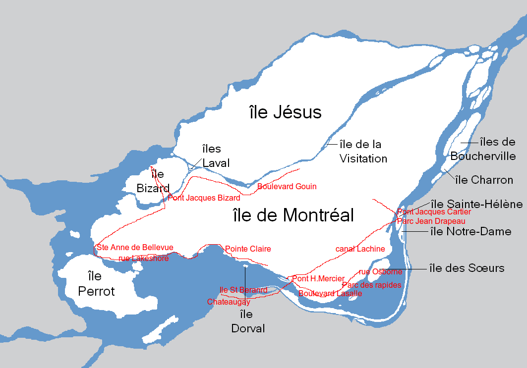 Un coup d’oeil sur la carte nous montre de manière évidente que Montréal est bâti sur une île. L’eau l’entoure de toute part: Le fleuve Saint-Laurent, la rivière de l’Outaouais et la rivière des prairies.