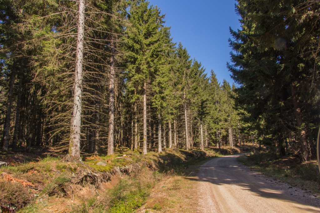 Entre 800 et 1300m les forets vert clair de feuillus et vert très sombre de résineux dominent un paysage austère . Les épicéa, abies, et autres Douglas ont partout pris le dessus, encouragés par une incitation publique au boisement standard.