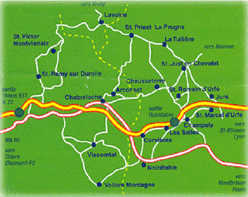 Nous sommes encore dans le département de La Loire. Les Salles c’est une zone de transition au pied des Bois Noirs. Le chemin de fer est arrivé en 1876 à Noirétable , un peu plus loin. Le péage de l’autoroute y est implanté ainsi que l’aire de service du Haut Forez. Nous ne sommes pas encore en Auvergne, l’Auvergne profonde. Demain, nous poursuivrons le périple de cette famille qui va se retrouver dans la Montagne Thiernoise, quelques km plus loin.